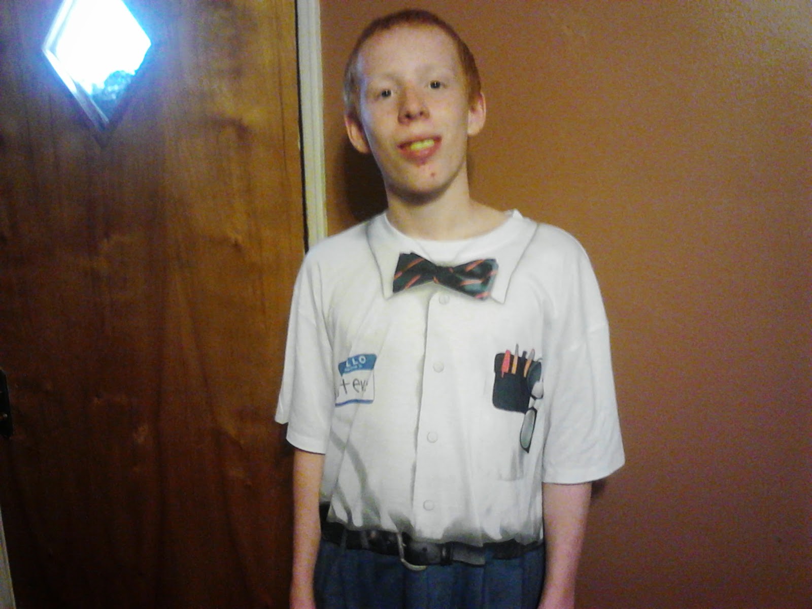 JaCoby dressed up as a nerd, he had glasses on too, but he broke them at recess, but at least he still had the fake buck teeth.